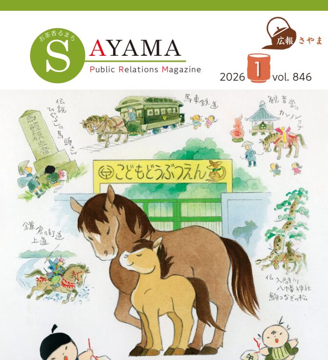 今月の表紙は、童絵作家の池原昭治さんによる、2026年の干支「午(うま)」を描いた新年イラストです。狭山市は鎌倉時代の昔から馬に関わる歴史があり、池原さんは市内の「こども動物園」の元気な馬たちをスケッチしてこの絵を描かれました。
