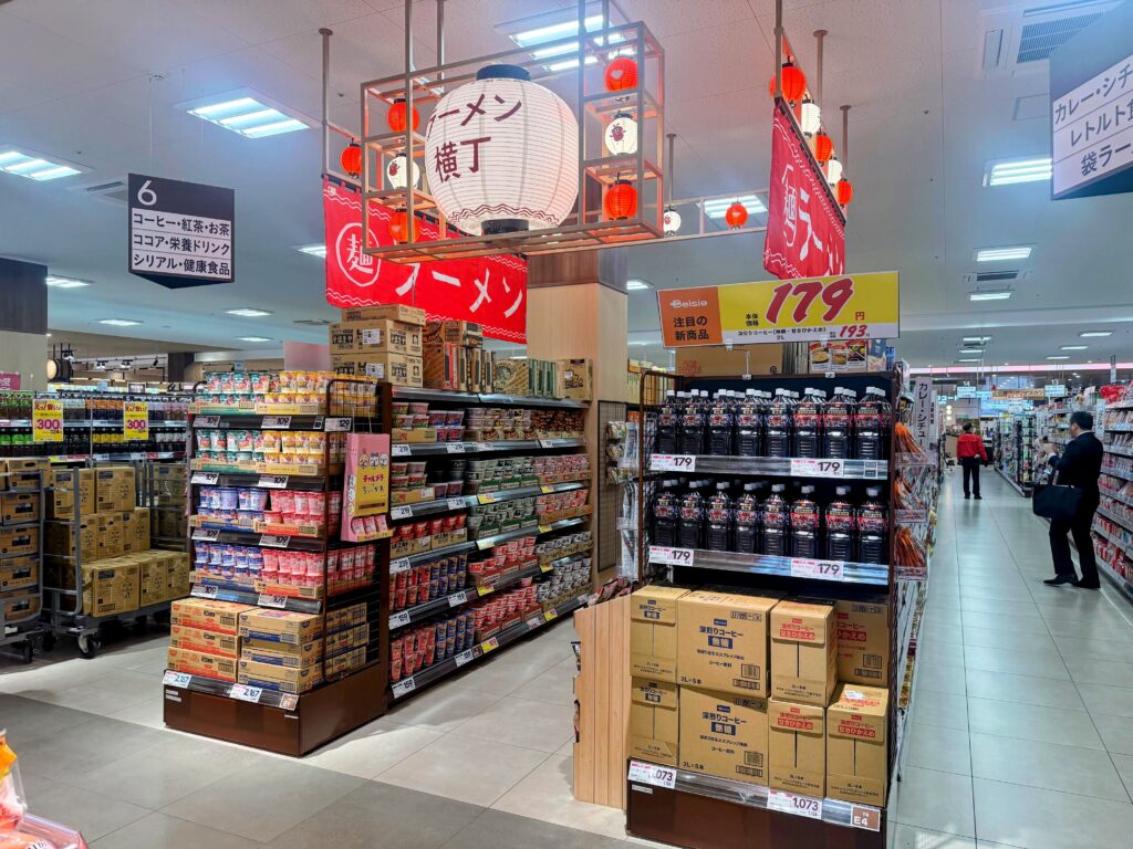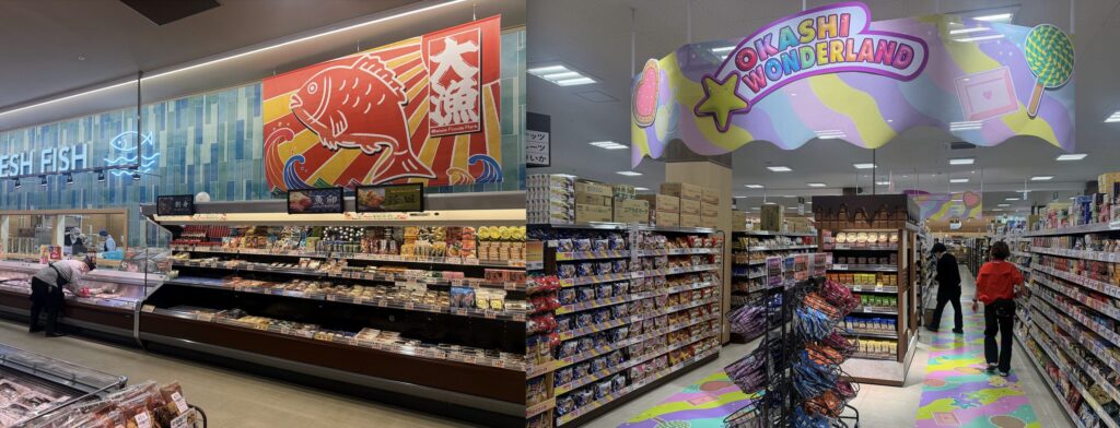 売り場も人気商品エリアについては、その専門コーナーというのがわかりやすいように、「ラーメン横丁」や「焼き鳥」、「OKASHI WONDERLAND」など特別なオブジェやサインがそれぞれ用意されていて、必要な商品がしっかりとまとまって陳列されています。