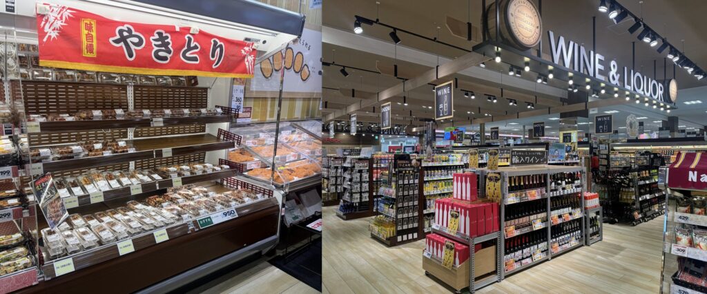 今回の新しいコンセプトの新狭山店の売り場配置は、過去ベイシアが地方店舗での様々な経験から、考えられた売り場配置となっています。例えば、一般的なスーパーではあまりない配置として、お惣菜コーナーと酒類のコーナーが隣接していることで、家飲み需要に対応し、これら商品の同時購入がしやすくなっています。