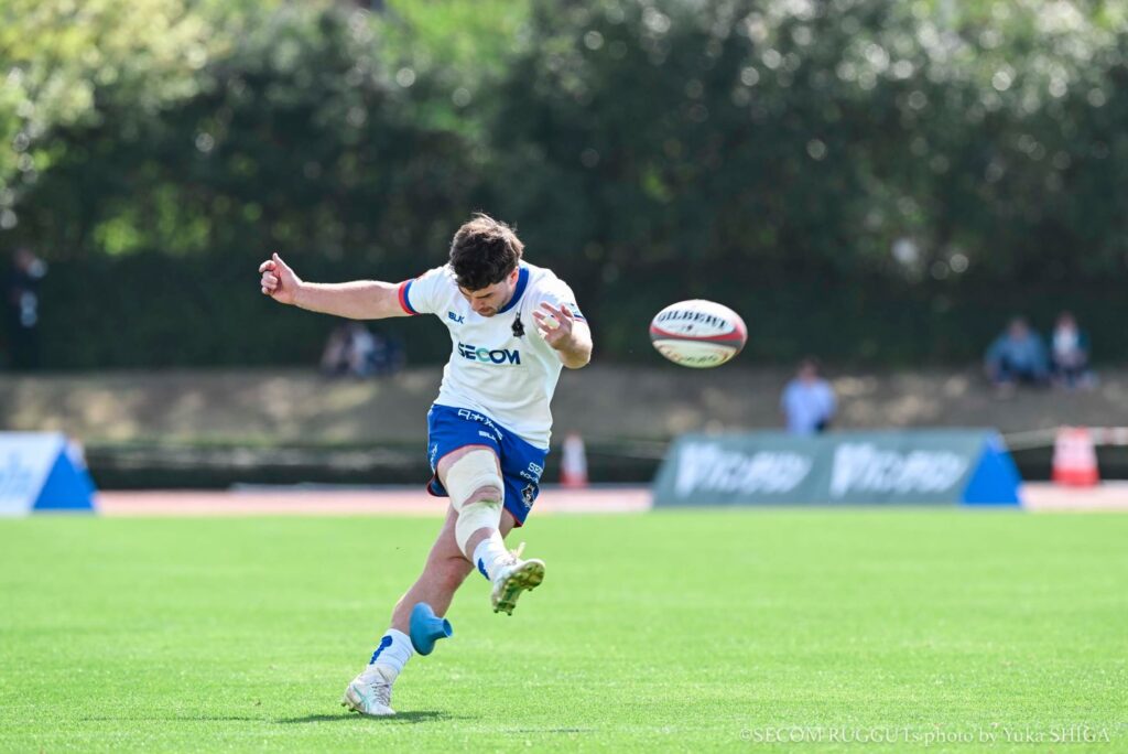 その後、WG昭島にトライを返され同点に追いつかれる場面もありましたが、31分にサム・スレイド選手が勝ち越しのトライ。終了間際にもダニエル・ウェイト選手がPGを沈め、20-12と8点リードで前半を折り返しました。