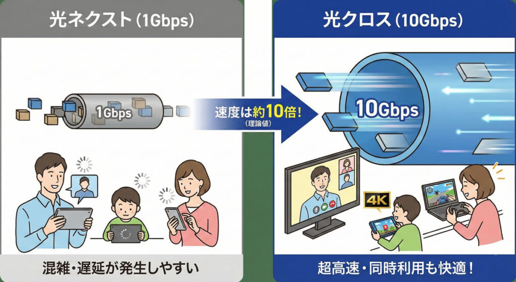 「フレッツ光クロス」は、最大10Gbpsという圧倒的な太いパイプを用意することで、この混雑を一気に解消します。