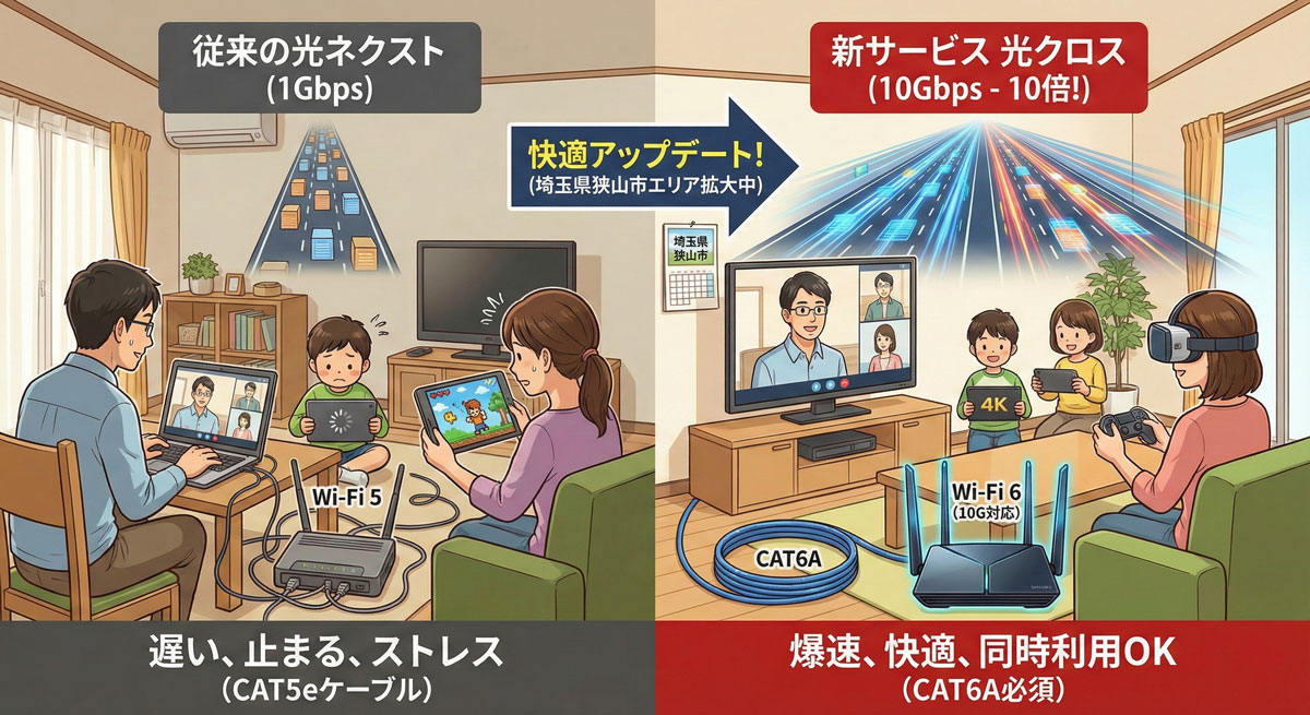 この記事では、狭山市でもエリア拡大中の次世代サービス「光クロス」について、従来プランとの違いや、申し込む前に絶対に知っておくべき注意点をわかりやすく解説します。