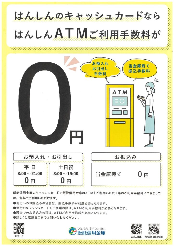 はんしんのキャッシュカードを使えば、はんしんのATMでのお引出し・お預入れ手数料は、時間帯にかかわらず「0円」です。