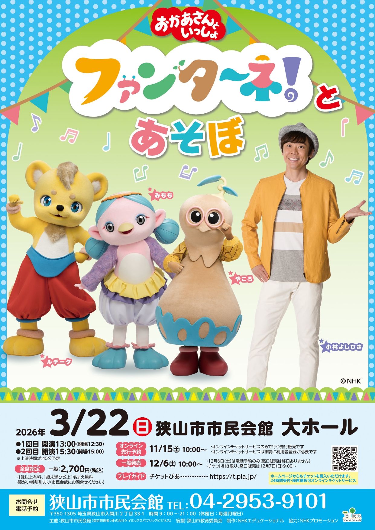 狭山市にお住まいのパパ・ママにビッグニュースです! Eテレ「おかあさんといっしょ」で大人気の「ファンターネ!」の仲間たちが、2026年3月22日(日)に狭山市市民会館(大ホール)にやってきます!