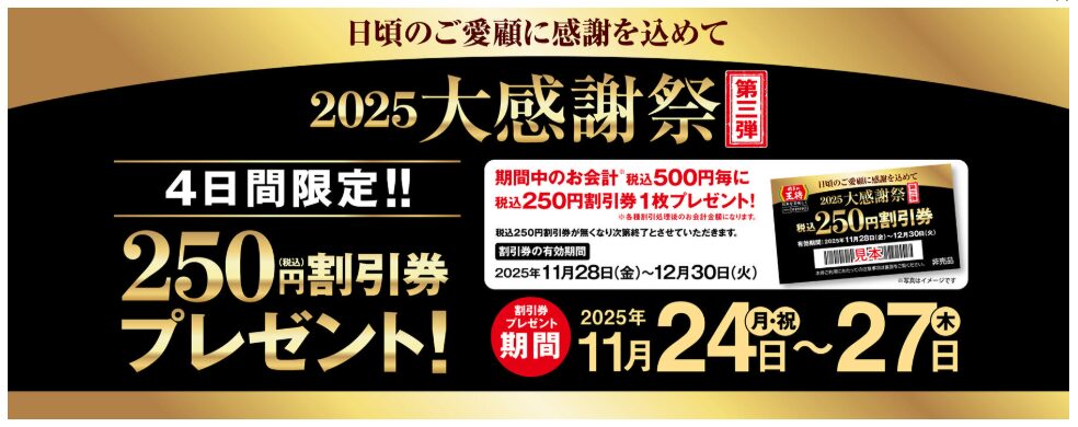 - 割引券配布期間: 2025年11月24日(月) ~ 11月27日(木)
