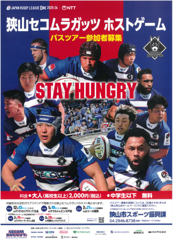 狭山市を拠点に活動するラグビーチーム「狭山セコムラガッツ」がいよいよ正念場を迎えます! 鍛え上げられた肉体が激突する衝撃音、一瞬で駆け抜けるスピード、そしてチーム一丸となって守り抜く「組織のセコム」の真骨頂。一度スタジアムで体感すれば、その熱狂の虜になること間違いありません。