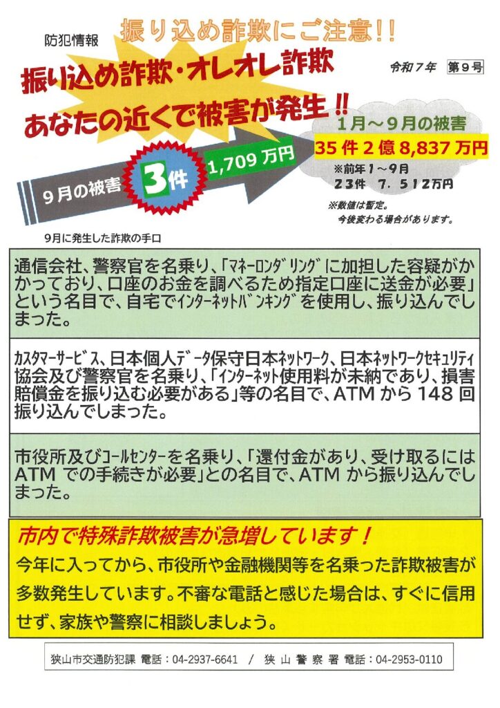現在、「2時間後に電話が使えなくなる」といった自動音声ガイダンスを使った詐欺電話が全国的に多発しており、狭山市にお住まいの方も十分な注意が必要です。