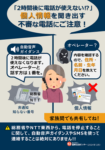 - 自動音声の電話 自宅の固定電話などに、総務省やNTTカスタマーセンターなどを名乗る電話がかかってきます。 「あなたの電話は2時間後に利用停止になります。オペレーターと話す方は1番を押してください」 といった自動音声が流れます。