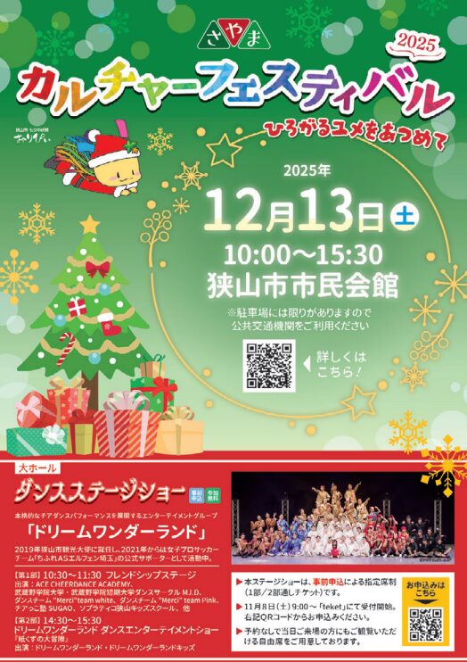2025年12月13日(土)、狭山市市民会館の全館を舞台に、多彩な文化体験ができる「さやまカルチャーフェスティバル2025 ~ひろがるユメをあつめて~」が開催されます。