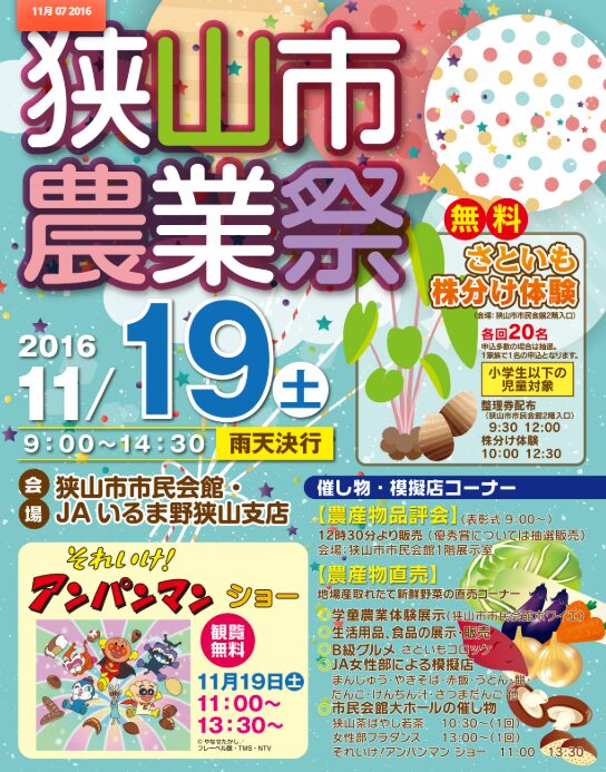 - ステージショー:「それいけ!アンパンマンショー」や、地元の団体によるフラダンスショー、狭山茶ばやしなどが予定されており、小さなお子様から大人まで楽しめます。
