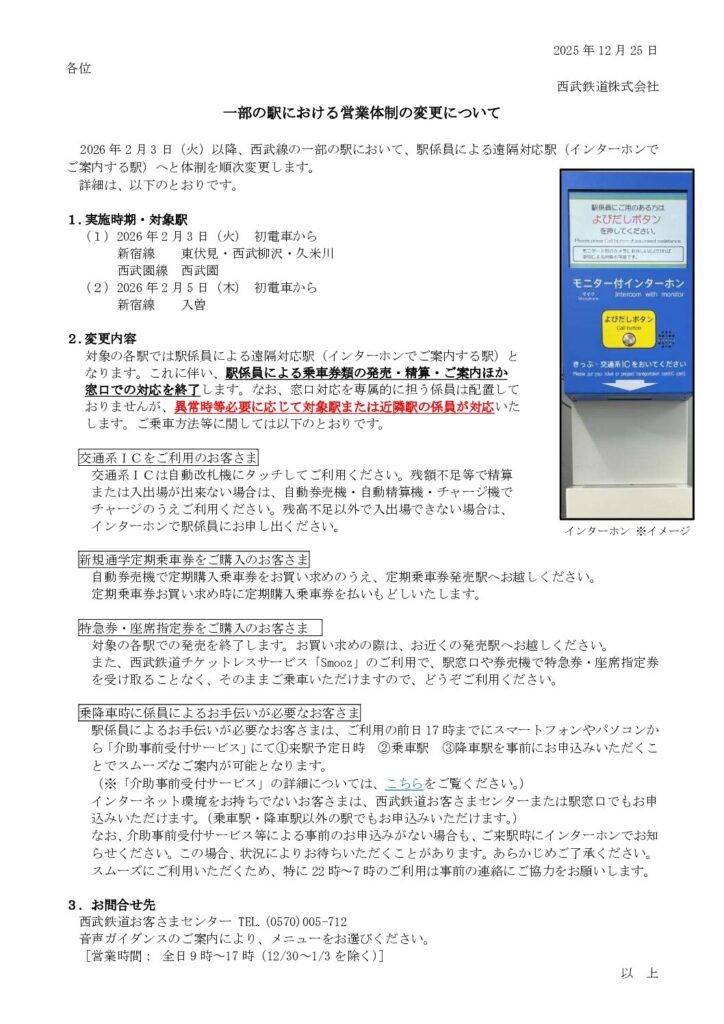 西武鉄道は、デジタル化やチケットレス化の進展に伴い、一部の駅で駅係員による窓口業務を終了し、インターホンによる「遠隔対応」へ移行することを発表しました。私たちの街、狭山市内の駅も対象となっています。