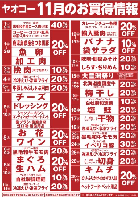 ヤオコーの魅力といえば、なんといっても「毎日のお買い得品」。新鮮な野菜やお肉、お魚、そしてヤオコーならではの美味しいお惣菜やパンが、日替わり・週替わりでお得に購入できます。値上げ、値上げが続く昨今、1か月のお買い得予定がわかるのはありがたいですね。コーヒーやペットフードなどの20%off は魅力的。調整ができそうなものはまとめ買いして節約したいですよね。